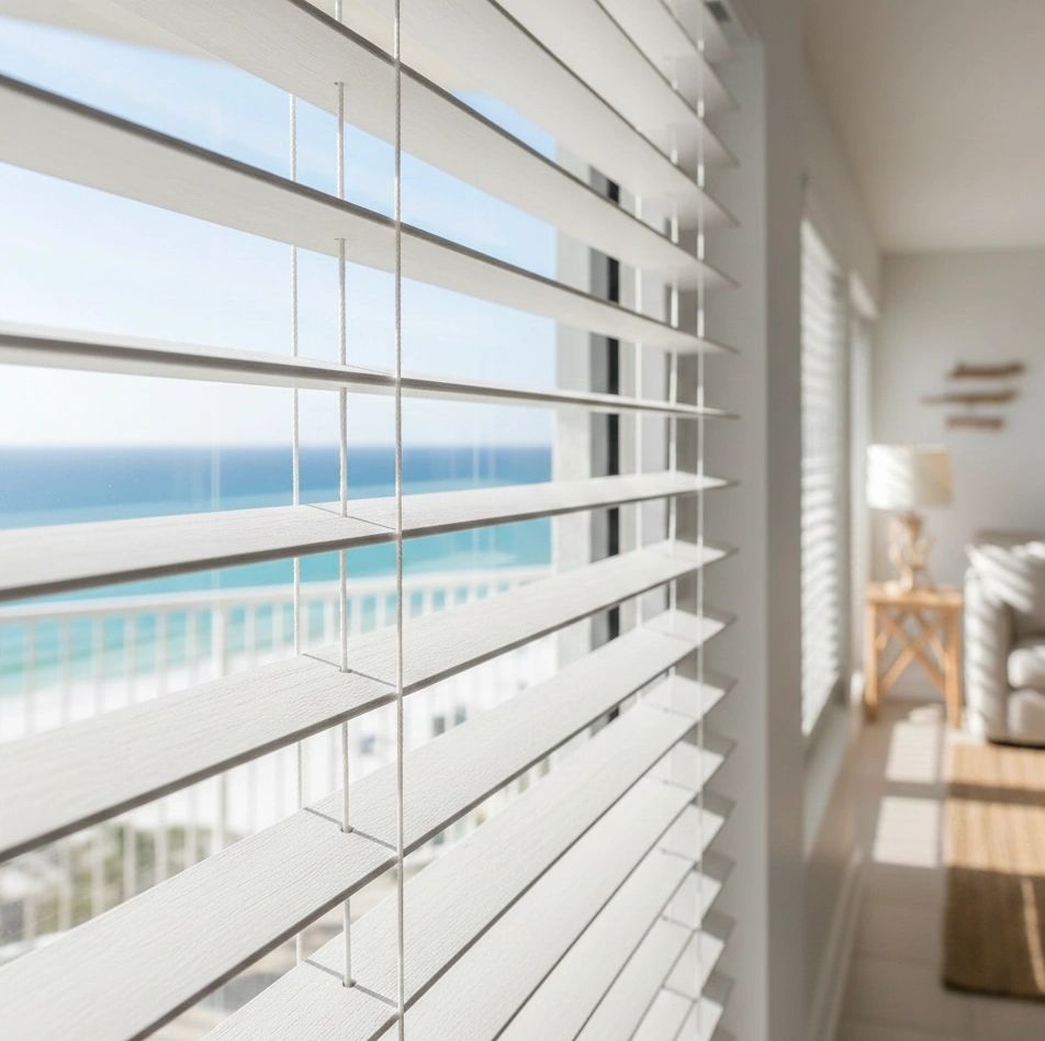 Plantation shutters remain a timeless window treatment for coastal homes. Their adjustable louvers allow homeowners to control sunlight while maintaining a bright and classic appearance.